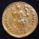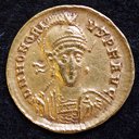 Roman gold solidus of Honorius (384-423). Images below document the obverse bust, the reverse personification of Constantinople, and a detail of the emperor in a crested helmet and diadem tied in the back, holding a spear and shield. Washington, D.C., Dumbarton Oaks Byzantine Collection.