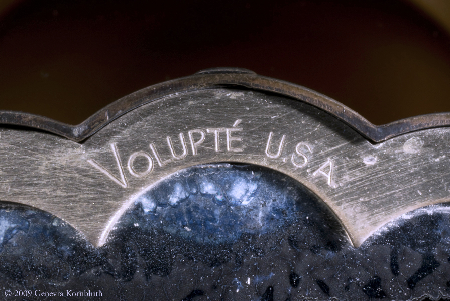 Volupté silver compact, probably early twentieth century. Images to the left and below document the completeness of the ensemble (case, powder net, and powder puff), the inscriptions, the damage to the mirror, and the cover engraved with an owner's initials. Private collection.