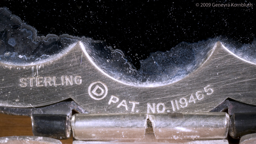 Volupté silver compact, probably early twentieth century. Images to the left and below document the completeness of the ensemble (case, powder net, and powder puff), the inscriptions, the damage to the mirror, and the cover engraved with an owner's initials. Private collection.