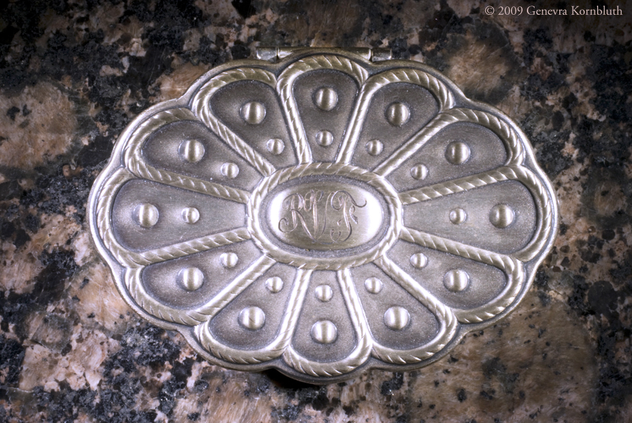 Volupté silver compact, probably early twentieth century. Images to the left and below document the completeness of the ensemble (case, powder net, and powder puff), the inscriptions, the damage to the mirror, and the cover engraved with an owner's initials. Private collection.