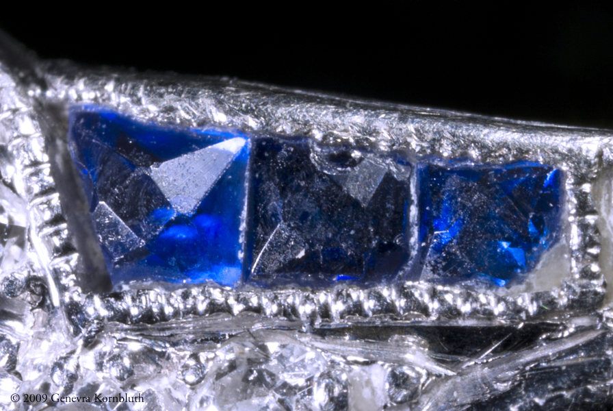 Platinum, diamond, and sapphire ring, dated 1933. The additional views below document its inscription, the unusual trapezoidal cut and chipping of its sapphires, and the clarity of its central diamond (seen from behind).