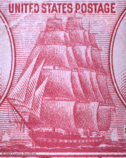United States stamp: Navy issue, USS Saratoga, 1936-37. The overall view documents the condition of the previously folded stamp. The details below show the configuration of the ship, and the man standing on the quarterdeck. Private collection.